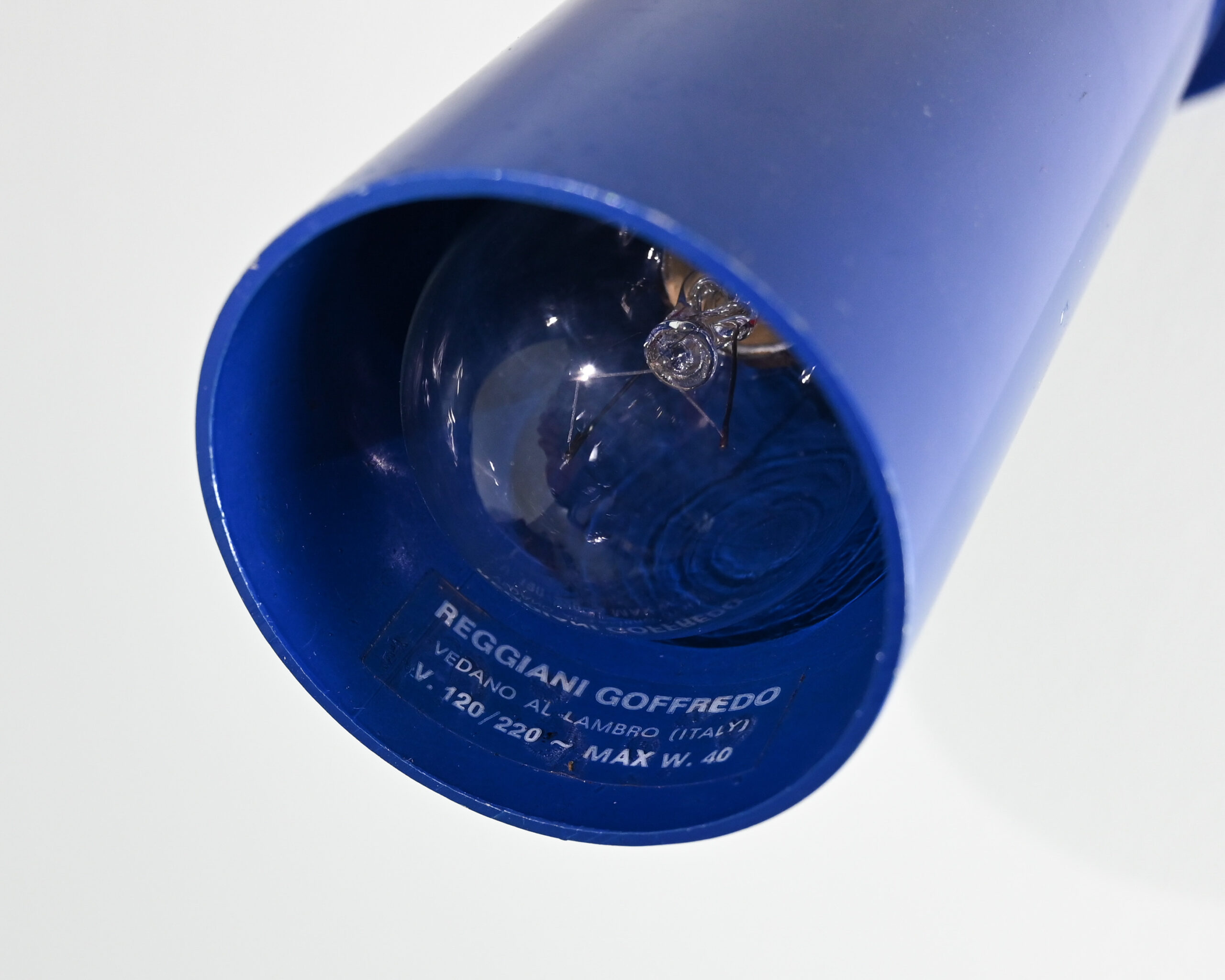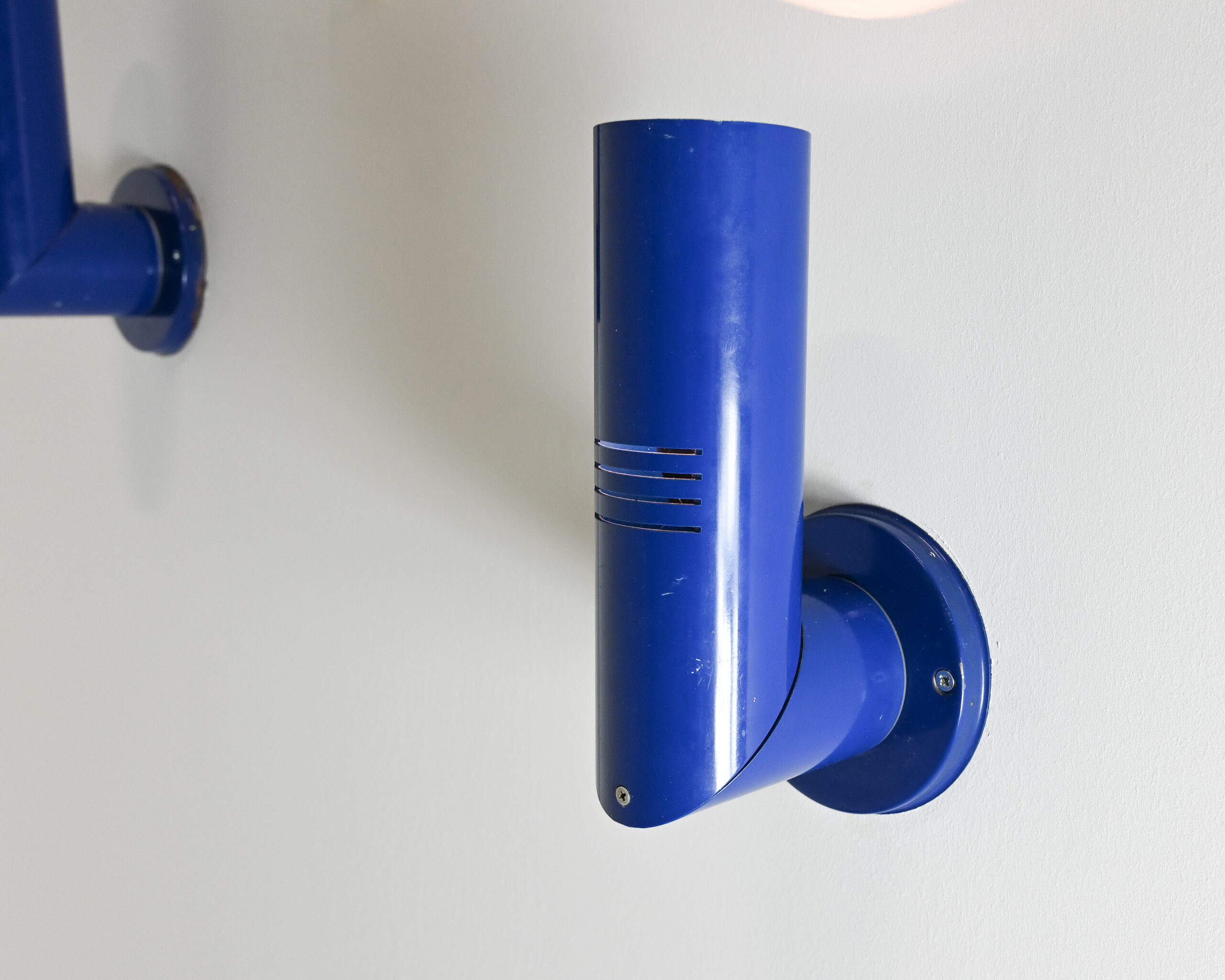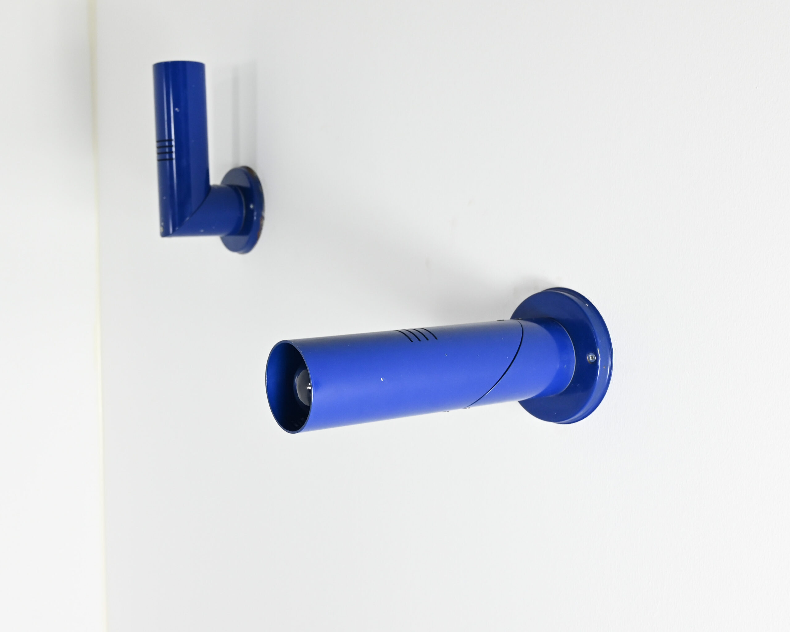 Paire d’appliques murales articulées bleues, du designer italien Goffredo Reggiani. Traces d’usage, fonctionne parfaitement.