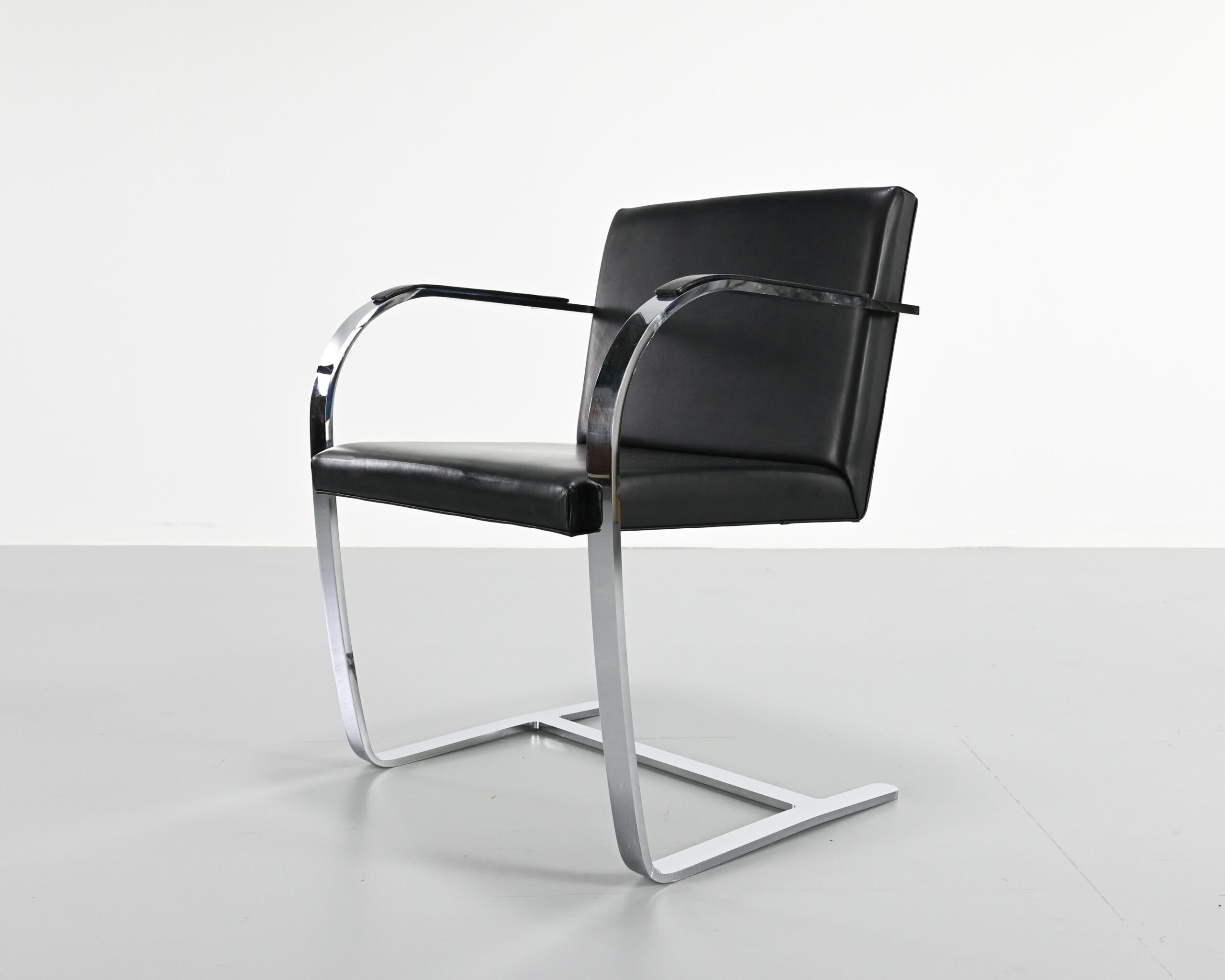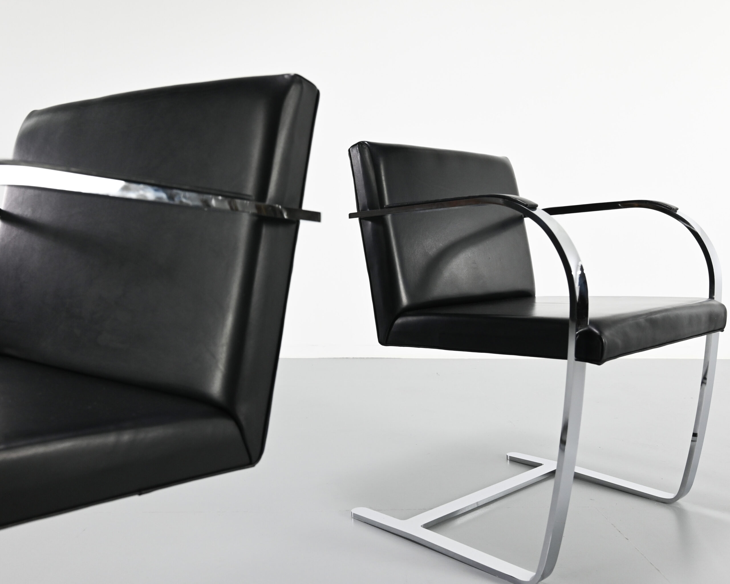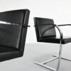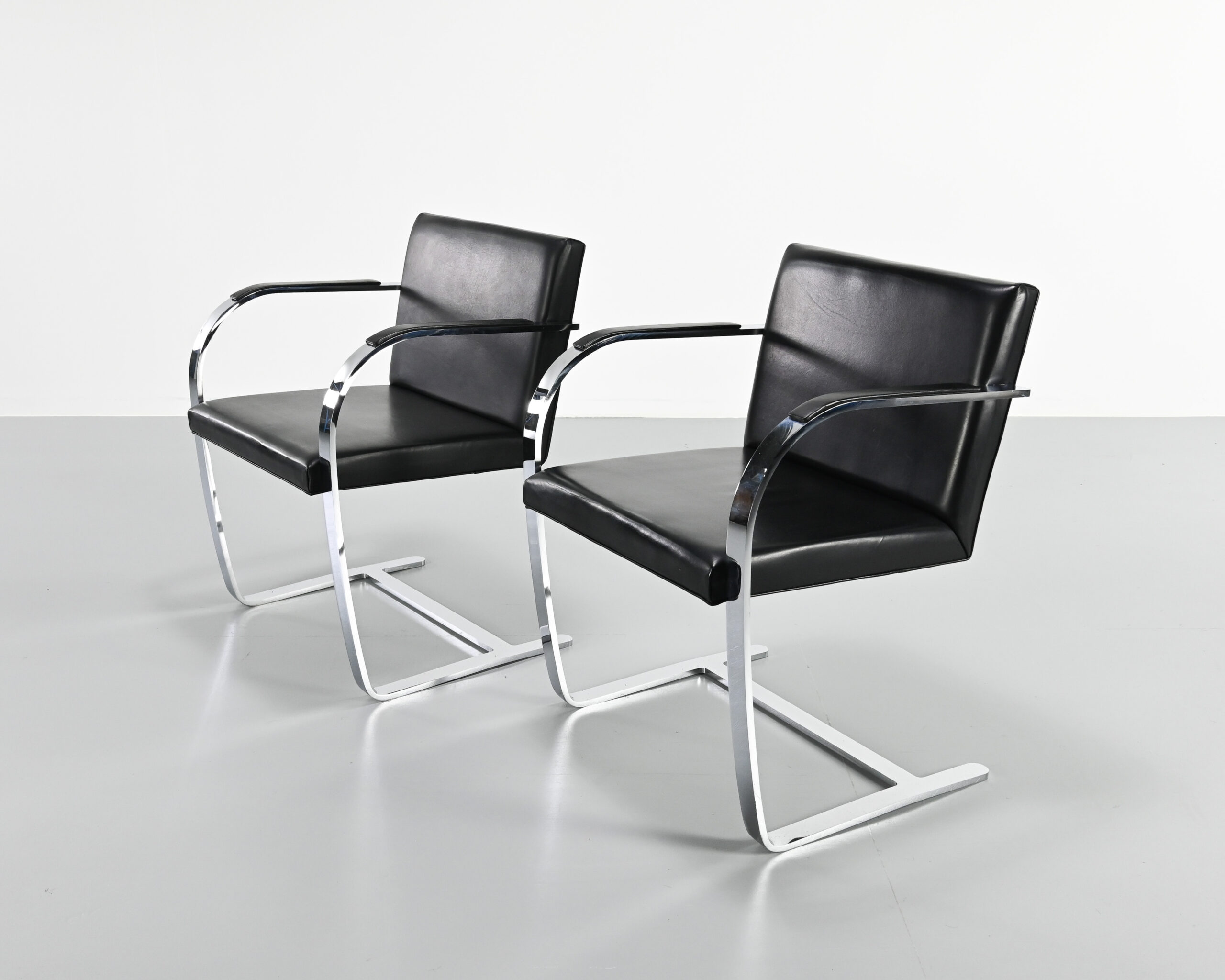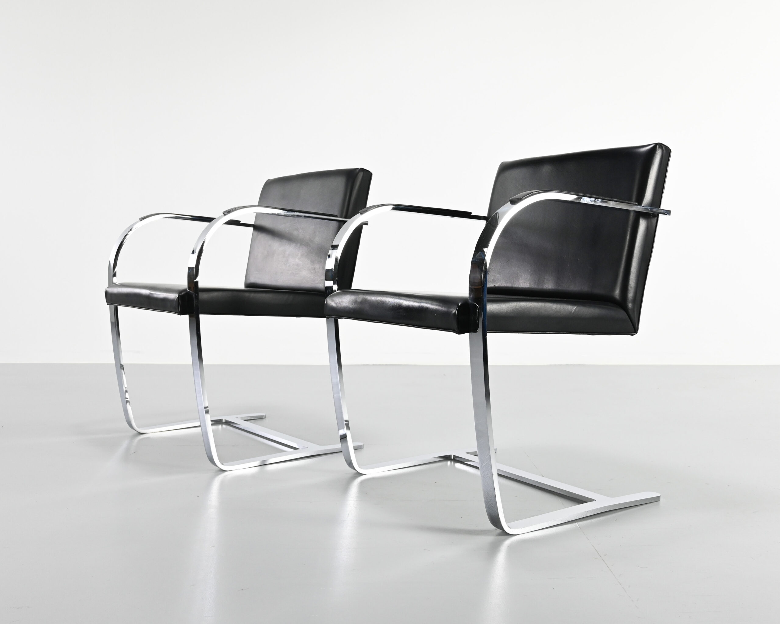 Paire de fauteuils modèle BRNO, en cuir noir et acier poli. Designer Mies Van Der Rohe. C.1960. Traces d’usage, bon état général.