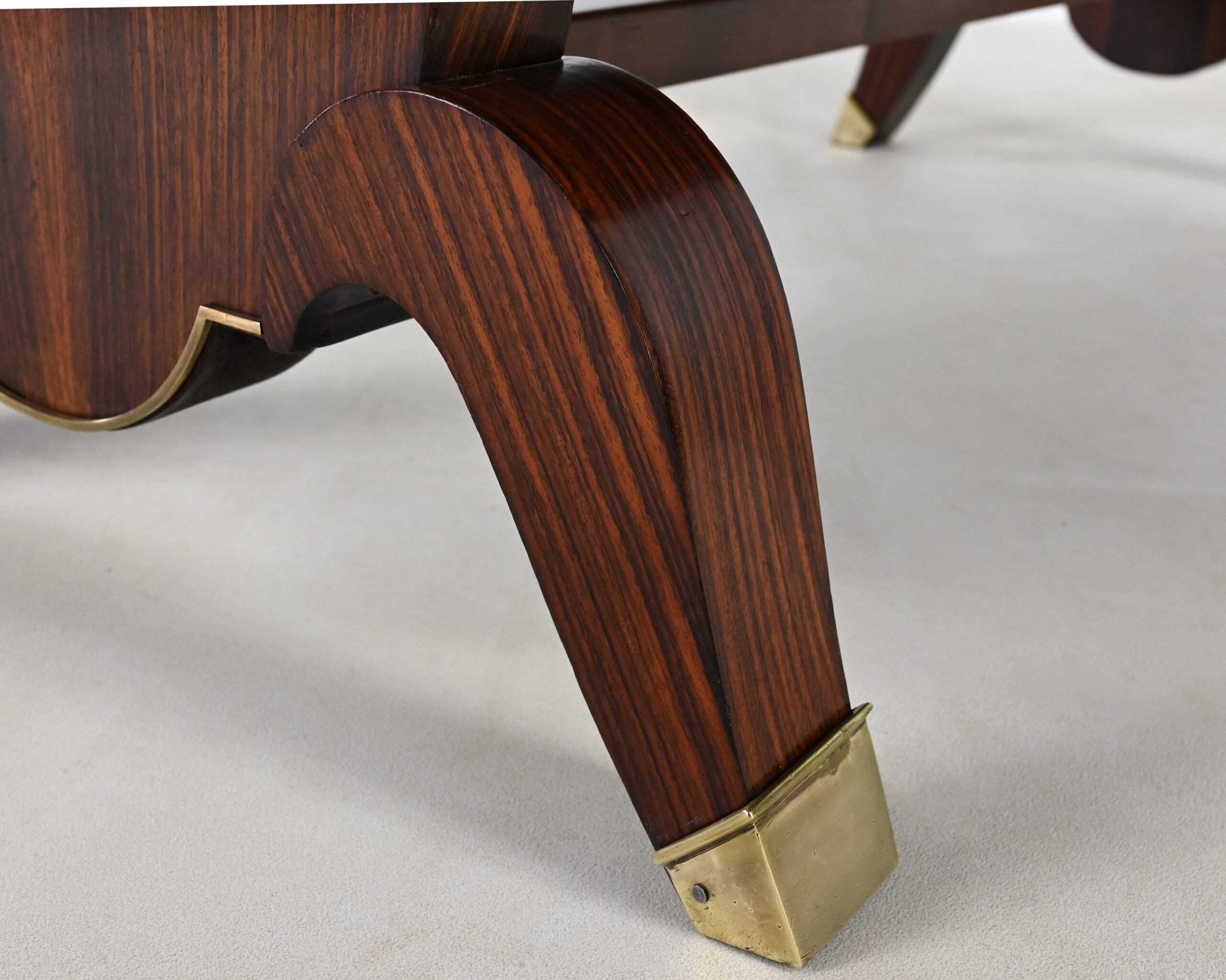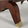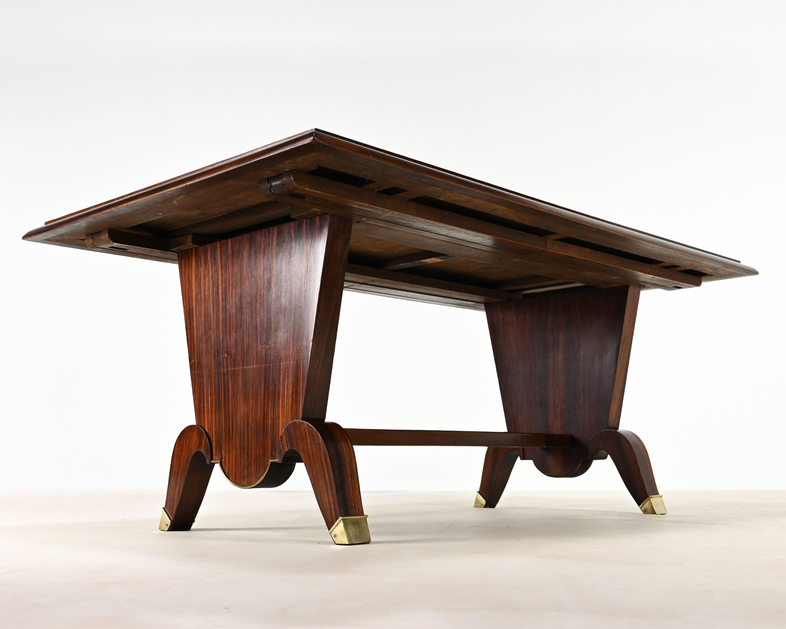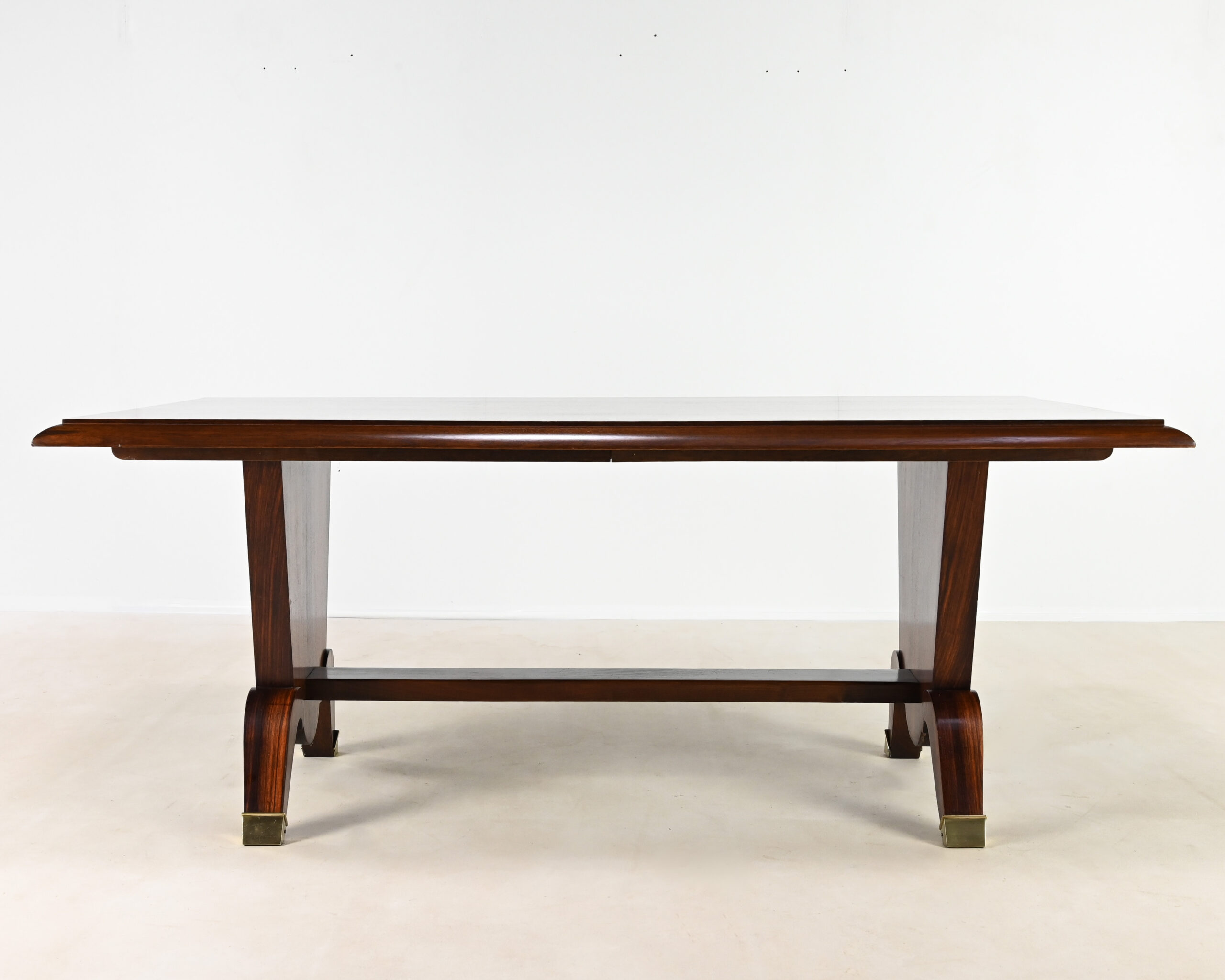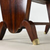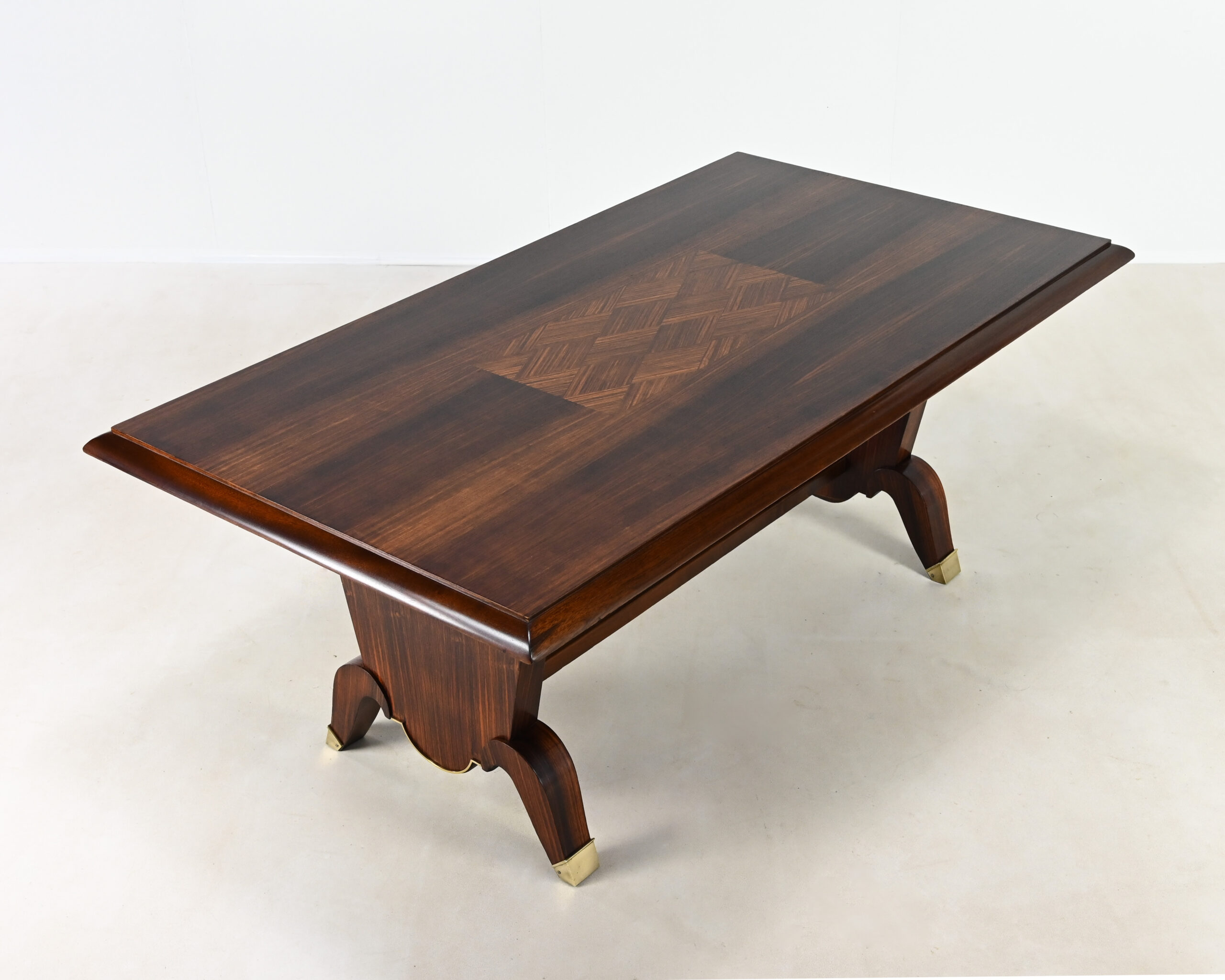 Superbe table de salle à manger Art-Déco, en placage de palissandre et marqueterie, rehaussée de laiton sur les pieds.