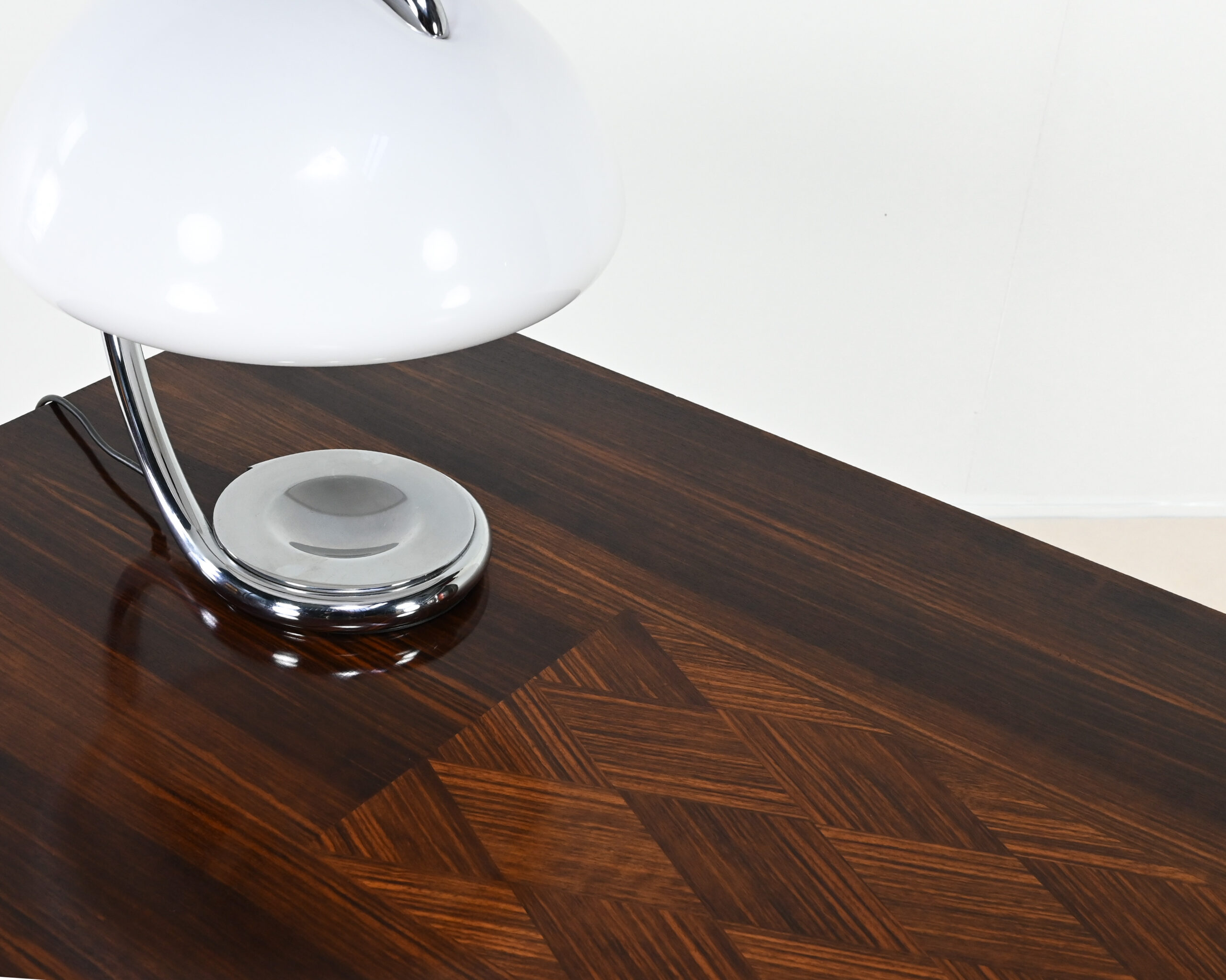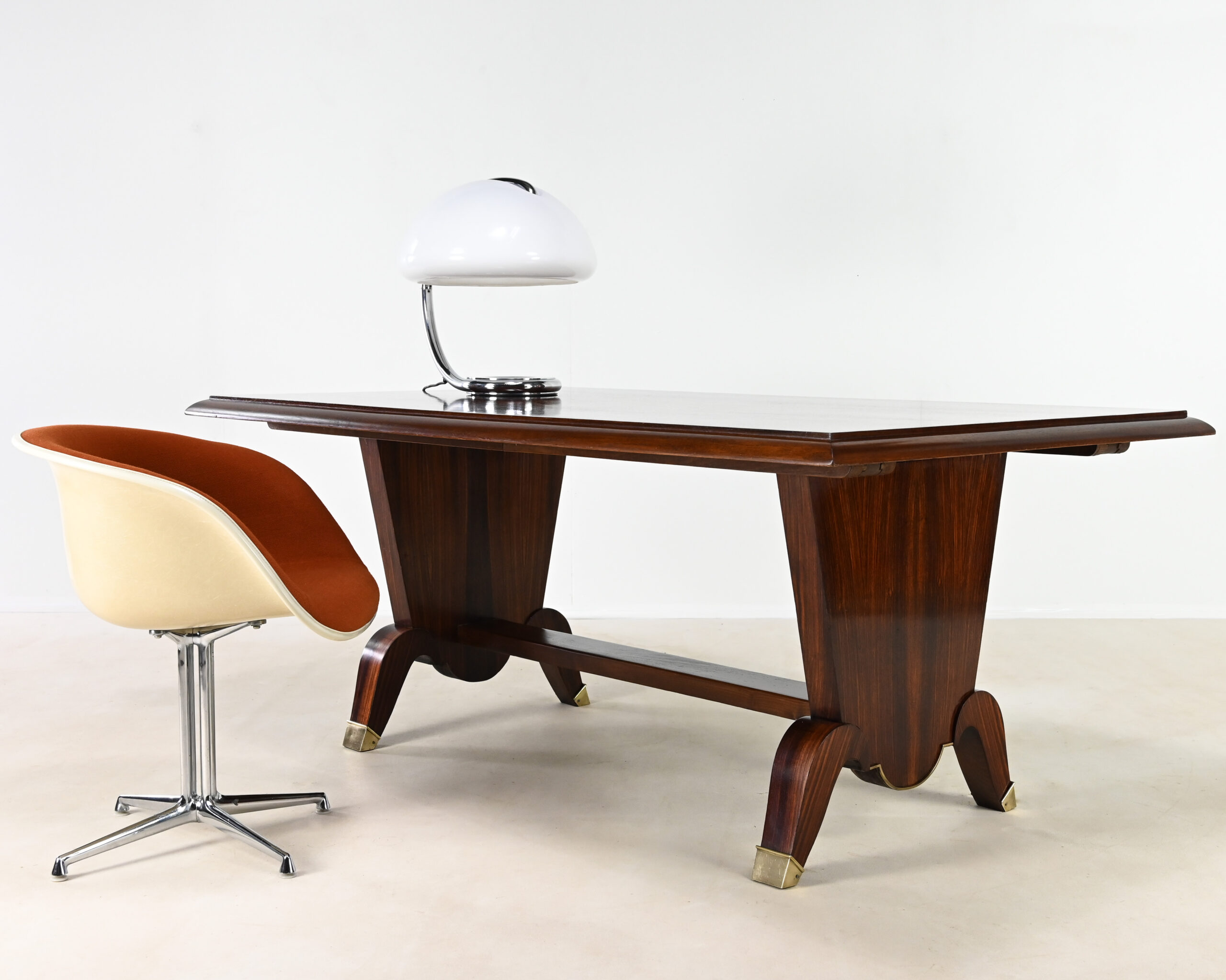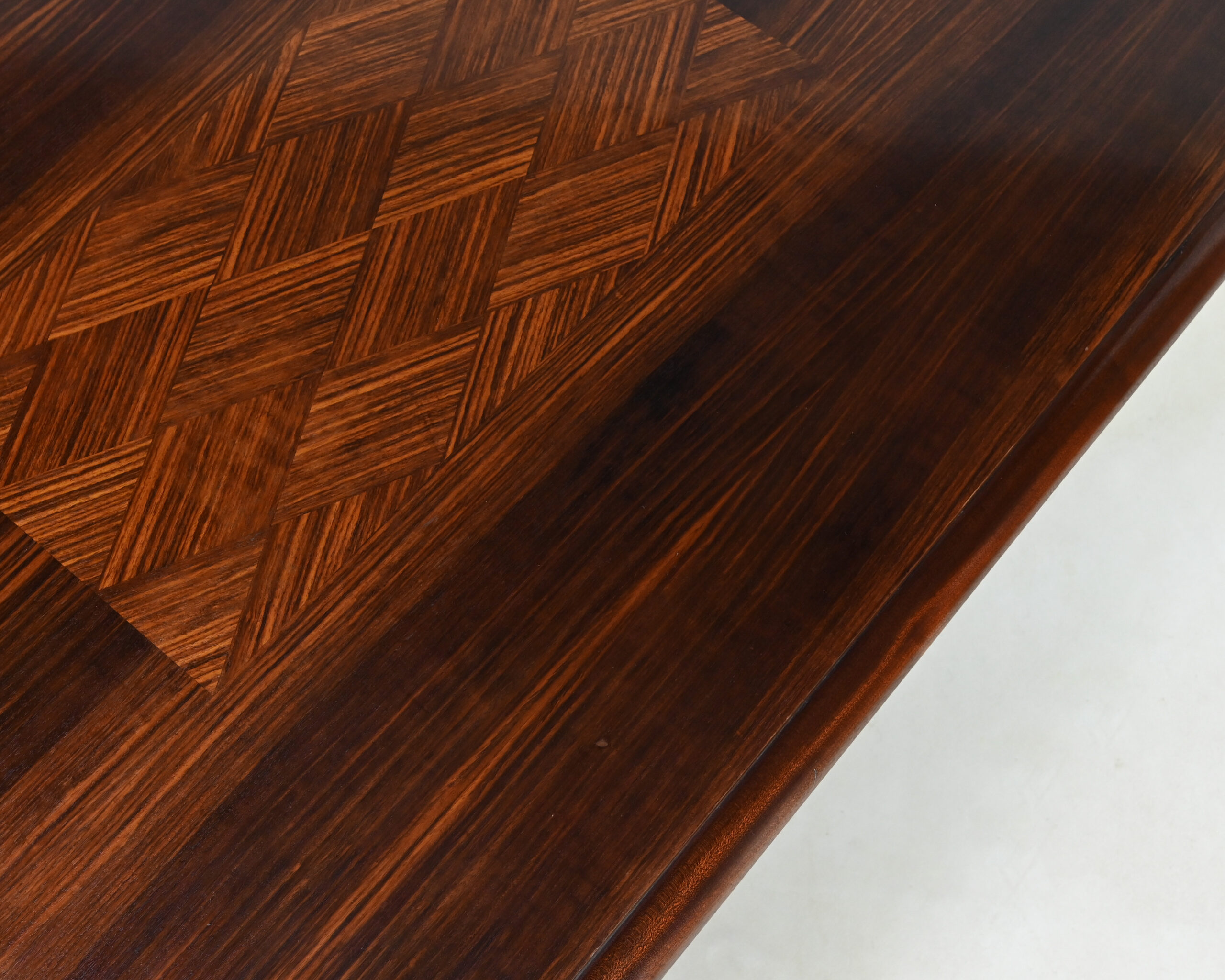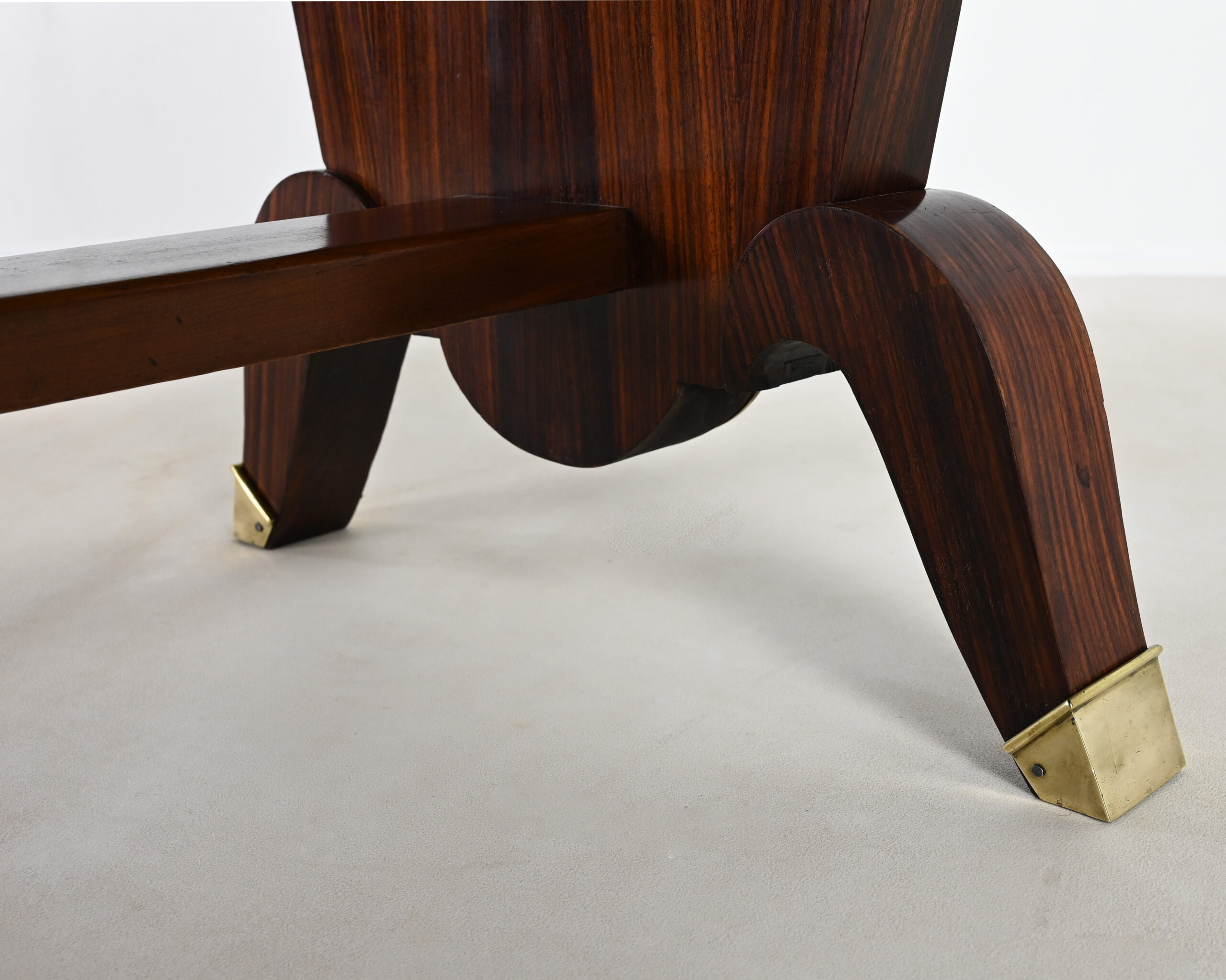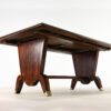 Superbe table de salle à manger Art-Déco, en placage de palissandre et marqueterie, rehaussée de laiton sur les pieds.